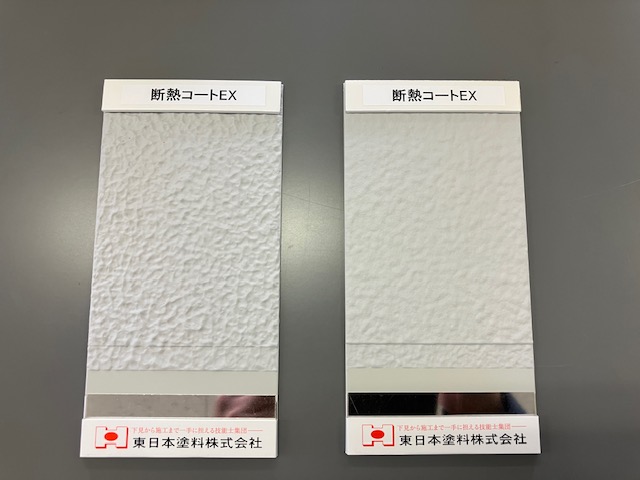 断熱コートEXの塗板。左がスチップル仕上、右がユズ肌仕上。