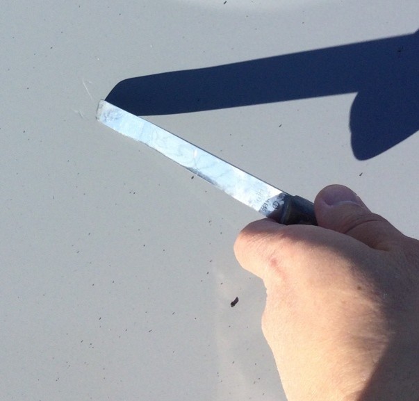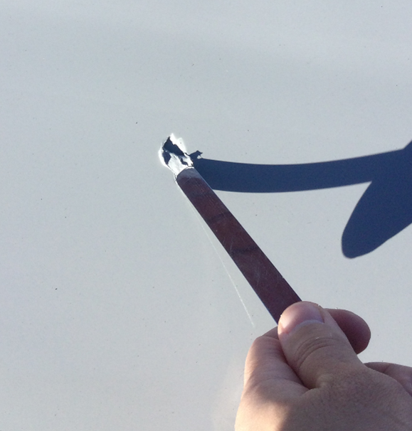 塗膜をつつくと塗膜が完全に硬化しておらず、未硬化のウレタン防水材が