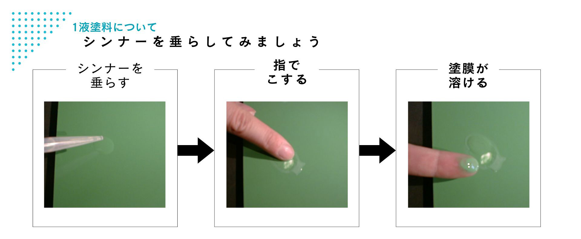 こんな感じで、シンナーを垂らすと1液溶剤系塗料は